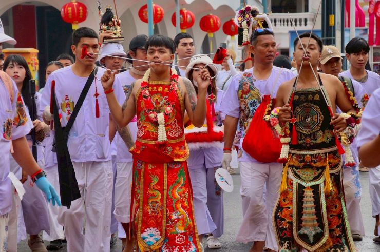 โดยเฉพาะ บริเวณ กระพุ้งแก้มและลิ้น และยังมีการอาบน้ำมัน ซึ่งเชื่อกันว่า เป็นการรับเคราะห์แทนผู้ถือศีลกินผัก ซึ่งตลอดเส้นทางที่ขบวนพระ ผ่าน มีประชาชน และนักท่องเที่ยวทั้งชาวไทย และต่างชาติ ร่วมชมขบวนพระ ตั้งโต๊ะหมู่บูชา รับพระ และจุดประทัด เนืองแน่นในถนนทุกสาย ที่องค์พระ ผ่าน
