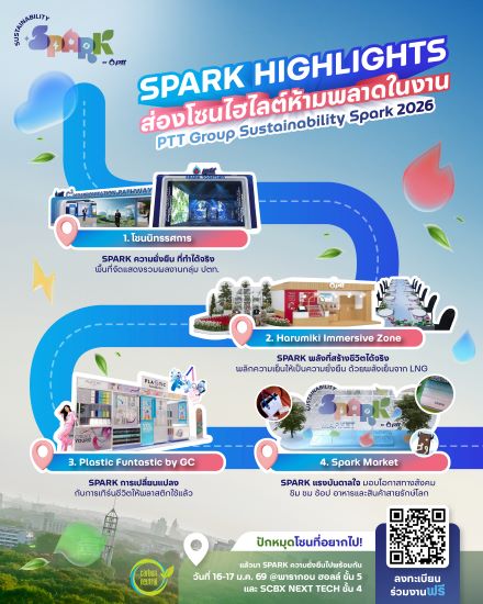 ปตท. และเครือข่ายพันธมิตรธุรกิจด้านความยั่งยืน 4 กลุ่ม ศักยภาพ : Low Carbon Solutions, Circular & Clean Tech, Social Innovation และ Green Investment & ESG Funding กลุ่ม ปตท. ขอเชิญชวนทุกท่านร่วมเป็นส่วนหนึ่งของการจุดประกายอนาคตที่ยั่งยืน ในงาน “Sustainability Spark by PTT Group 2026: Sparking the Future พลังจุดประกายอนาคต” ระหว่าง วันที่ 16-17 มกราคม 2569 ณ พารากอน ฮอลล์ ชั้น 5 และ SCBX NEXT TECH ชั้น 4