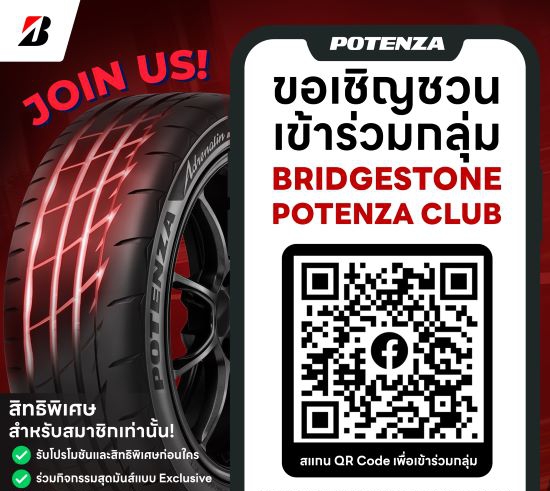 นับเป็นอีกก้าวสำคัญ ที่ตอกย้ำความเป็นผู้นำด้านนวัตกรรมยางรถยนต์สมรรถนะสูงของบริดจสโตน และเชื่อมโยงเหล่านักขับทั่วประเทศที่มี passion เดียวกัน ให้มาร่วมสัมผัสพลังแห่งการขับขี่ที่สนุก และปลอดภัย…จากยางบนสนามแข่งสู่การใช้งานจริงบนถนนในสไตล์ BRIDGESTONE POTENZA เข้าร่วมเป็นส่วนหนึ่งของคอมมูนิตี้คนรัก BRIDGESTONE POTENZA ได้ที่ Facebook Group: BRIDGESTONE POTENZA CLUB https://www.facebook.com/groups/potenzaclub