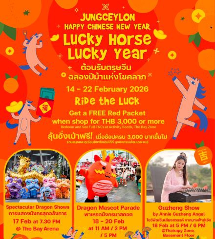 ศูนย์การค้าจังซีลอน ป่าตอง ภูเก็ต ขอเชิญชวนชาวภูเก็ต นักท่องเที่ยวทั้งชาวไทย และชาวต่างชาติ ร่วมเฉลิมฉลองเทศกาลตรุษจีน ต้อนรับปีม้าไฟอย่างยิ่งใหญ่ในงาน “JUNGCEYLON Lucky Horse – Lucky Year” ที่ขนขบวนกิจกรรมต่างๆ เพื่อเสริมความเป็นสิริมงคลพร้อมสร้างสีสัน และบรรยากาศให้ครึกครื้นมาก ยิ่งขึ้น อาทิ เสริมโชคลาภปีม้าไฟกับ การแสดงขบวนมังกรเงินมังกรทอง LED สุดอลังการ, การแสดงเชิดสิงโตมงคล 5 สี, การแสดงกายกรรมผาดโผนสิงโตกระโดดเสาดอกเหมย, พิธีเบิกเนตรสิงโต, การแสดงโชว์พิณจีน “เสียงสวรรค์จากนางฟ้ากู่เจิง” และพาเหรดมาสคอตมังกรอ้วง 5 สี ขวัญใจเด็ก ๆ และนักท่องเที่ยว ณ ลานกิจกรรมเดอะเบย์ อารีน่า ระหว่าง วันที่ 17 – 20 ก.พ. 69 พิเศษกับโปรโมชั่น “Ride the Luck” เมื่อช้อปสินค้าภายในศูนย์การค้าครบทุก 3,000 บาทขึ้นไป สามารถนำใบเสร็จมาร่วม “ลุ้นโชค รับ อั่งเปา” ได้ที่บูธ Tourist Privilege ตั้งแต่ วันนี้ – 22 ก.พ. 69 โดยสามารถติดตามรายละเอียด ได้ที่ Jungceylon Fanpage หรือสอบถามข้อมูลเพิ่มเติมโทร. 076-600-111 (กิจกรรมฟรีตลอดทั้งงาน)