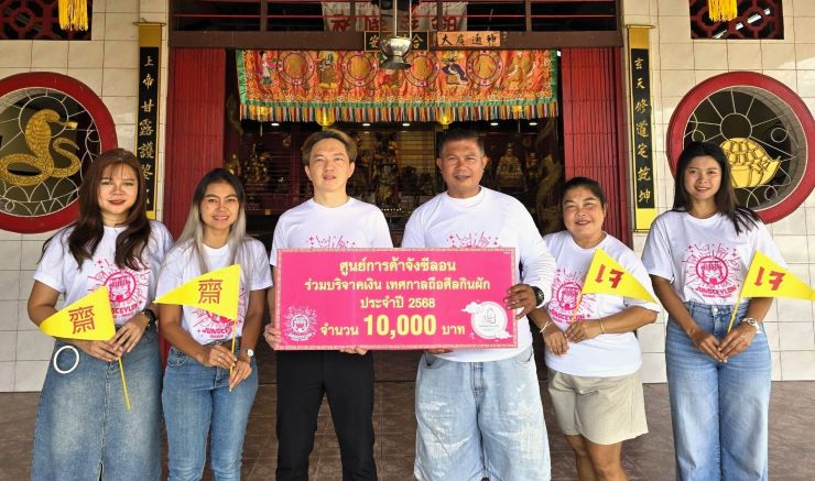 นายแจ็คกี้ เธีย ผู้จัดการทั่วไป ศูนย์การค้าจังซีลอน ป่าตอง ภูเก็ต (ที่ 3 จาก ซ้าย) นำทีม พนักงานบริษัท ภูเก็ตสแควร์ จำกัด ร่วมมอบน้ำดื่มและเงินบริจาคสนับสนุนประเพณีถือศีลกินผักประจำปี 2568 ให้กับ ศาลเจ้าทุ่งทอง (ศาลเจ้าเฮี้ยนเทียนซ่งเต่) จำนวนเงิน 10,000 บาท เพื่อนำเงินไปใช้จ่ายตามวัตถุประสงค์ โดยมี นายพิเชษฐ์ นวลจันทร์ ประธานศาลเจ้าทุ่งทอง (ที่ 3 จาก ขวา) เป็นตัวแทนรับมอบ ณ ศาลเจ้าทุ่งทอง อำเภอกะทู้ จังหวัดภูเก็ต เมื่อเร็ว ๆ นี้