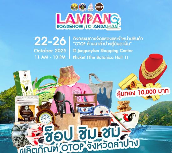 ศูนย์การค้าจังซีลอน ป่าตอง ภูเก็ต ร่วมกับ สำนักงานพัฒนาชุมชนจังหวัดลำปาง เตรียมจัดงาน “Lampang Roadshow to Andaman” กิจกรรมการจัดแสดงและจําหน่ายสินค้า ผลิตภัณฑ์ชุมชน “OTOP ล้านนาลําปางสู่อันดามัน” ภายใต้โครงการพัฒนาผู้ประกอบการและยกระดับศักยภาพสินค้าจังหวัดลําปาง ภายในงานพบกับกิจกรรมมากมาย อาทิ การจำหน่ายสินค้า OTOP ผลิตภัณฑ์ชุมชน อาหาร จากผู้ประกอบการจังหวัดลำปาง, ชมการสาธิตทำอาหารจากสมาคมเชฟภูเก็ต, ชมนิทรรศการผลิตภัณฑ์ OTOP ผลิตภัณฑ์ชุมชน, ร่วมทำกิจกรรมเวิร์กชอปงานหัตถกรรมจากจังหวัดลำปาง และกิจกรรม “ลด แลก แจก แถม” และลุ้นรางวัลใหญ่ “ทองคำมูลค่ากว่า 10,000 บาท” นอกจากนั้นเต็มอิ่มไปกับทัพศิลปินและอินฟลูเอนเซอร์ชื่อดังมากมาย ที่ขนขบวนมาสร้างความบันเทิงกัน ตั้งแต่วันที่ 22 – 26 ต.ค. 68 นี้ ณ โซนเดอะโบทานิกา ฮอลล์1