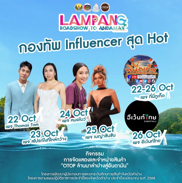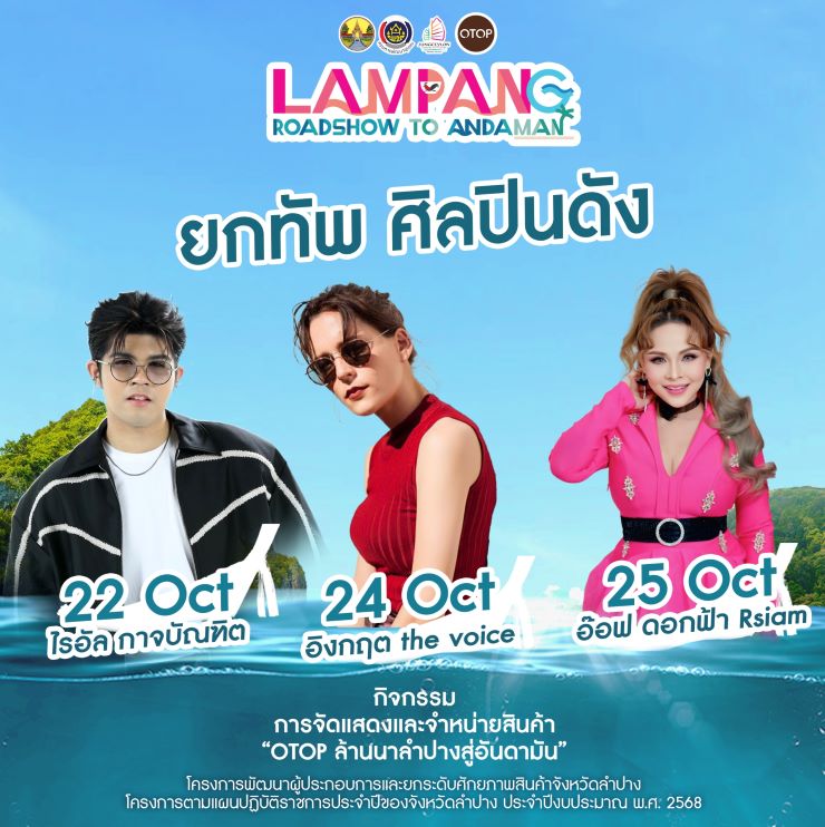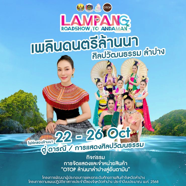 ศูนย์การค้าจังซีลอน ป่าตอง ภูเก็ต ร่วมกับ สำนักงานพัฒนาชุมชนจังหวัดลำปาง เตรียมจัดงาน “Lampang Roadshow to Andaman” กิจกรรมการจัดแสดงและจําหน่ายสินค้า ผลิตภัณฑ์ชุมชน “OTOP ล้านนาลําปางสู่อันดามัน” ภายใต้โครงการพัฒนาผู้ประกอบการและยกระดับศักยภาพสินค้าจังหวัดลําปาง ภายในงานพบกับกิจกรรมมากมาย อาทิ การจำหน่ายสินค้า OTOP ผลิตภัณฑ์ชุมชน อาหาร จากผู้ประกอบการจังหวัดลำปาง, ชมการสาธิตทำอาหารจากสมาคมเชฟภูเก็ต, ชมนิทรรศการผลิตภัณฑ์ OTOP ผลิตภัณฑ์ชุมชน, ร่วมทำกิจกรรมเวิร์กชอปงานหัตถกรรมจากจังหวัดลำปาง และกิจกรรม “ลด แลก แจก แถม” และลุ้นรางวัลใหญ่ “ทองคำมูลค่ากว่า 10,000 บาท” นอกจากนั้นเต็มอิ่มไปกับทัพศิลปินและอินฟลูเอนเซอร์ชื่อดังมากมาย ที่ขนขบวนมาสร้างความบันเทิงกัน ตั้งแต่วันที่ 22 – 26 ต.ค. 68 นี้ ณ โซนเดอะโบทานิกา ฮอลล์1