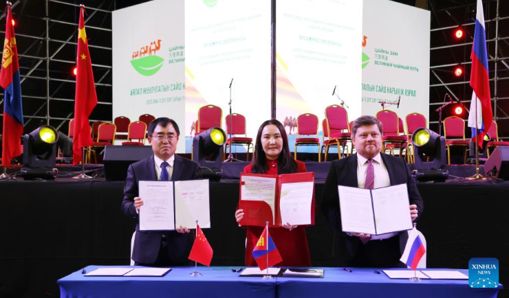 (แฟ้มภาพซินหัว : การลงนามแผนความร่วมมือและพัฒนาการท่องเที่ยวบนเส้นทางสายชาระหว่าง จีน-รัสเซีย-มองโกเลีย ประจำปี 2025-2026 ณ การประชุมรัฐมนตรีกระทรวงการท่องเที่ยวจีน รัสเซีย และมองโกเลีย ครั้งที่ 9 ในเมืองดาร์คาน ทางตอนเหนือของมองโกเลีย วันที่ 7 พ.ย. 2025)