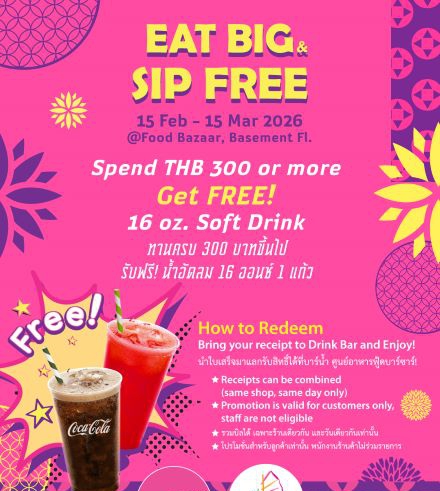 ศูนย์การค้าจังซีลอน ป่าตอง ภูเก็ต จับมือ ร้านอาหารภายในโซนฟู้ดบาร์ซาร์ (Food Bazaar) ศูนย์รวมอาหารนานาชาติ ที่มีเมนูอาหารคาว หวานให้เลือกอิ่มอร่อยมากมาย จัดแคมเปญพิเศษเอาใจนักท่องเที่ยวสายกิน กับ โปรโมชั่น “EAT BIG & SIP FREE” เมื่อรับประทานอาหารครบทุก 300 บาทขึ้นไป รับฟรี! น้ำอัดลมรสชาติใดก็ได้ ขนาด 16 ออนซ์ 1 แก้วทันที เพียงนำใบเสร็จมารับสิทธิ์ที่บาร์น้ำ ณ ศูนย์อาหารฟู้ดบาร์ซาร์ ชั้นใต้ดิน โซนเดอะจังเกิ้ล ศูนย์การค้าจังซีลอน ป่าตอง ภูเก็ต (ขอสงวนสิทธิ์รวมบิลได้เฉพาะร้านเดียวกัน และภายในวันเดียวกันเท่านั้น) เริ่มแล้ว ตั้งแต่ วันนี้ – 15 มี.ค. 69 สามารถติดตามรายละเอียดโปรโมชั่น ได้ที่ https://www.facebook.com/JungceylonFanpage หรือสอบถามข้อมูลเพิ่มเติมโทร. 076-600-111