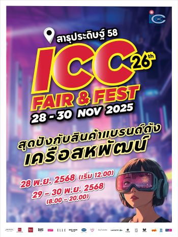 กลับมาอีกครั้ง กับมหกรรมช้อปสุดคุ้ม ส่งท้ายปีของ บริษัท ไอ.ซี.ซี. อินเตอร์เนชั่นแนล จำกัด (มหาชน) ในงาน ICC Fair & Fest ครั้งที่ 26 (ไอ.ซี.ซี. แฟร์ แอนด์ เฟส ครั้งที่ 26) พบสินค้าคุณภาพ จาก แบรนด์ดัง กว่า 60 แบรนด์ ในเครือสหพัฒน์ฯ ขนมาลดกระหน่ำสูงสุด 80% อาทิ ARROW / GUY LAROCHE LACOSTE เครื่องสำอางและของใช้สตรี BSC /ELLE / WACOAL, ของใช้สำหรับแม่และเด็ก ABSORBA / ENFANT สินค้าอุปโภคบริโภคอย่าง เปา / มาม่า / เอสเซนส์ สินค้าญี่ปุ่นยอดนิยมจาก TSURUHA / Daiso พิเศษ ! สมาชิก His & Her รับสิทธิประโยชน์สุดคุ้ม และ บริการบูธตัดผมฟรี จาก สมาคมช่างตัดผมแห่งประเทศไทย