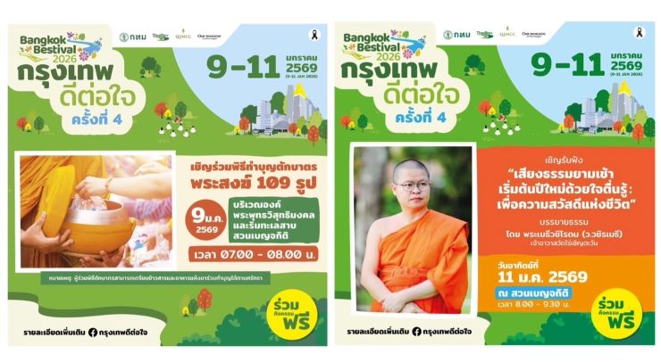 เริ่มต้นปีใหม่ อย่างเป็นสิริมงคล ในงานเทศกาล “กรุงเทพดีต่อใจ” Bangkok Bestival 2026 ครั้งที่ 4 ขอเชิญ ร่วมทำบุญใหญ่ต้นปี ท่ามกลางความสงบร่มรื่นของสวนป่าเบญจกิติ เพื่อน้อมถวายเป็นพระราชกุศลแด่สมเด็จพระนางเจ้าสิริกิติ์ พระบรมราชินีนาถ พระบรมราชชนนีพันปีหลวง อันเป็นการเริ่มต้นปีใหม่ ด้วยความเป็นสิริมงคล และน้อมรำลึกถึงพระราชปณิธาน “ป่ารักน้ำ” ที่ทรงมุ่งดูแลผืนป่า และต้นน้ำของแผ่นดิน ซึ่งเป็นรากฐานของความอุดมสมบูรณ์ สู่สวนป่าเบญจกิติ ที่วันนี้ทำหน้าที่หล่อเลี้ยงชีวิต และหัวใจของคนเมือง ด้วยธรรมชาติอันยั่งยืน