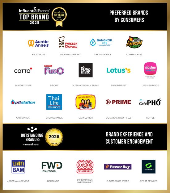 • รางวัลแบรนด์ที่ทรงอิทธิพลต่อผู้บริโภคมากที่สุด (Top Influential Brand) ได้แก่ กรุงเทพประกันชีวิต, กู๊ดเมท, คอตโต้, คาเฟ่ อเมซอน, ไทยประกันชีวิต, ปตท., ฟันโอ, มิสเตอร์ โดนัท, เมืองไทยประกันชีวิต, โลตัส, สามแม่ครัว, อานตี้ แอนส์ และ Prime