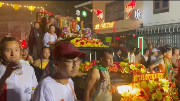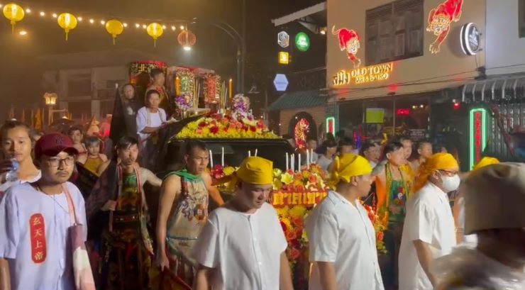 ซึ่งในขบวนมีทั้งม้าทรง และพี่เลี้ยงม้าทรง รวมถึงชาวภูเก็ต นักท่องเที่ยวทั้งชาวไทย และต่างชาติต้อนรับอยู่ตลอด 2 ข้างทางถนน ทำให้บนท้องถนนหนาแน่นไปด้วยประชาชนหลายพ้นคน ผู้มีจิตศรัทธามาร่วมเข้าชม ทำพิธี และตั้งโต๊ะถวายน้ำชา กันอย่างเนืองแน่น เพื่อเป็นสิริมงคลแก่ตนเอง และครอบครัว