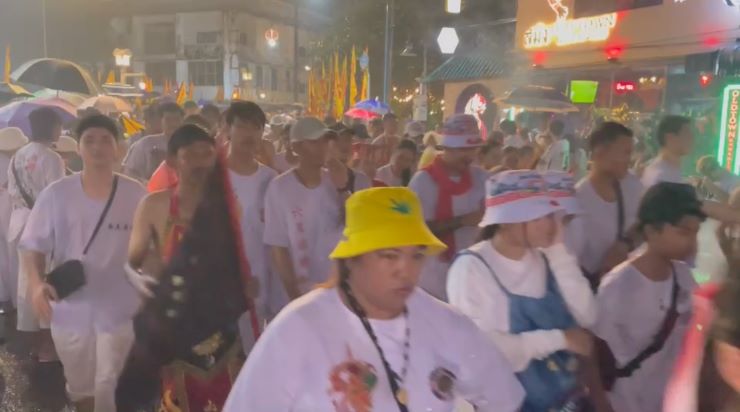 ซึ่งในขบวนมีทั้งม้าทรง และพี่เลี้ยงม้าทรง รวมถึงชาวภูเก็ต นักท่องเที่ยวทั้งชาวไทย และต่างชาติต้อนรับอยู่ตลอด 2 ข้างทางถนน ทำให้บนท้องถนนหนาแน่นไปด้วยประชาชนหลายพ้นคน ผู้มีจิตศรัทธามาร่วมเข้าชม ทำพิธี และตั้งโต๊ะถวายน้ำชา กันอย่างเนืองแน่น เพื่อเป็นสิริมงคลแก่ตนเอง และครอบครัว
