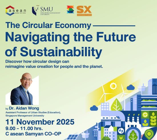 11 พฤศจิกายน 2568 นี้ มาร่วมเรียนรู้แนวคิด “เศรษฐกิจหมุนเวียน (Circular Economy)” ที่จะเปลี่ยนโลกให้ยั่งยืน กับ C asean Special Talk หัวข้อ “The Circular Economy – Navigating the Future of Sustainability” จัดโดย ศูนย์ C asean ร่วมกับ Singapore Management University (SMU) และ Sustainability Expo (SX) มีวัตถุประสงค์เพื่อแบ่งปันแนวคิด หลักการ และการประยุกต์ใช้แนวทางเศรษฐกิจ หมุนเวียน (Circular Economy)
