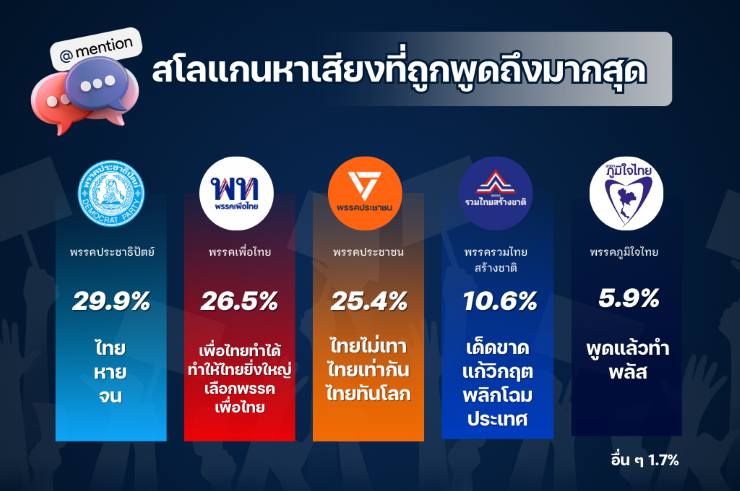 สโลแกนที่ถูกพูดถึงมากที่สุดใน 5 อันดับแรก ได้แก่ “ไทยหายจน” จากพรรคประชาธิปัตย์ ครองอันดับ 1 ด้วย 29.9%, ตามมาด้วย “เพื่อไทยทำได้ทำให้ไทยยิ่งใหญ่ เลือกพรรคเพื่อไทย” จากพรรคเพื่อไทย 26.5%, “ไทยไม่เทา – ไทยเท่ากัน -ไทยทันโลก” จากพรรคประชาชน 25.4% “เด็ดขาดแก้วิกฤตพลิกโฉมประเทศ” จากพรรครวมไทยสร้างชาติ 10.6%, “พูดแล้วทำพลัส” จากพรรคภูมิใจไทย 5.9% และ อื่น ๆ 1.7%