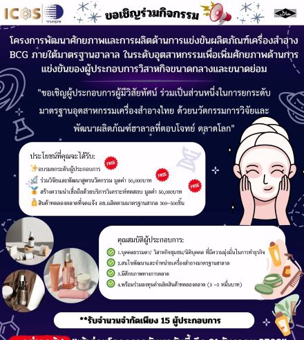 กระทรวงการอุดมศึกษา วิทยาศาสตร์ วิจัยและนวัตกรรม (อว.) โดย ศูนย์บริการนวัตกรรมเวชสำอางแบบครบวงจร (ICOS) ในสังกัด ศูนย์เชี่ยวชาญนวัตกรรมผลิตภัณฑ์สมุนไพร สถาบันวิจัยวิทยาศาสตร์และเทคโนโลยีแห่งประเทศไทย (วว.) เชิญชวน ผู้ประกอบการ เข้าร่วมโครงการพัฒนาศักยภาพและการผลิตด้านการแข่งขันผลิตภัณฑ์เครื่องสำอาง BCG ภายใต้มาตรฐานฮาลาลในระดับอุตสาหกรรม เพื่อเพิ่มศักยภาพด้านการแข่งขันของผู้ประกอบการวิสาหกิจขนาดกลางและขนาดย่อม เปิดรับสมัครตั้งแต่บัดนี้ถึงวันที่ 31 ธันวาคม 2568 **รับจำนวนจำกัดเพียง 15 ผู้ประกอบการ** เท่านั้น !!