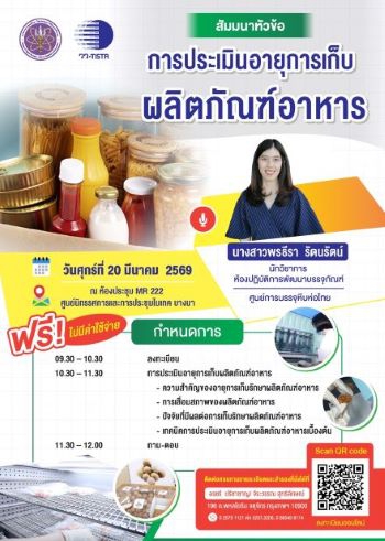 กระทรวงการอุดมศึกษา วิทยาศาสตร์ วิจัยและนวัตกรรม (อว.) โดย ศูนย์การบรรจุหีบห่อไทย สถาบันวิจัยวิทยาศาสตร์และเทคโนโลยีแห่งประเทศไทย (วว.) จัดสัมมนาฟรี! หัวข้อ “การประเมินอายุ การเก็บผลิตภัณฑ์อาหาร” ในวันที่ 20 มีนาคม 2569 ณ ห้อง MR 222 ไบเทค บางนา ถ่ายทอดความรู้โดยวิทยากรผู้เชี่ยวชาญ พร้อมแลกเปลี่ยนข้อคิดเห็น เพื่อเสริมแกร่งผู้ประกอบการไทย ด้วยวิทยาศาสตร์ เทคโนโลยีและนวัตกรรม
