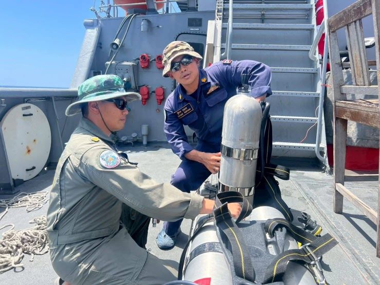 ศูนย์บัญชาการเหตุการณ์แก้ไขสถานการณ์ฯ ได้ส่ง ร.ล.หนองสาหร่าย ซึ่งเป็นเรือประเภทล่าทำลายทุ่นระเบิด สังกัด กองเรือทุ่นระเบิด กองเรือยุทธการ แห่งราชนาวีไทย เข้าร่วมปฏิบัติภารกิจ โดยเรือลำนี้มีขีดความสามารถสูงในการสำรวจวัตถุใต้น้ำ เนื่องจากมีระบบตรวจจับใต้น้ำ (Sonar) และมียาน Plutino สำหรับสำรวจ และเก็บภาพนิ่ง รวมทั้ง ภาพเคลื่อนไหว เพื่อนำข้อมูลมาประเมิน วิเคราะห์ ในการเข้าไปเก็บกู้เรือ และตู้สินค้า นอกจากนี้ ยังมีห้องปรับบรรยากาศ ใช้สำหรับการบำบัดด้วยออกซิเจนความดันสูง (Chamber) สำหรับความปลอดภัยให้กับนักดำน้ำ