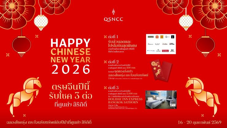 กรุงเทพฯ —ศูนย์การประชุมแห่งชาติสิริกิติ์ ต้อนรับเทศกาลตรุษจีนปีม้า 2569 ชวน ฉลองความเฮง ความปัง กับแคมเปญสุดพิเศษ “ฉลองโชครุ่ง กระโจนรับทรัพย์กับปีม้า” กิจกรรมรับโชค 3 ต่อ ทั้งส่วนลด ชุดซองอั่งเปา และห้องพักจากโรงแรมชั้นนำ ตลอด 5 วันเต็ม ตั้งแต่ วันที่ 16–20 กุมภาพันธ์ 2569 รับโชคต่อที่ 1 : โปรโมชันพิเศษจากร้านค้าภายในศูนย์ฯ สิริกิติ์ เพลิดเพลินกับส่วนลด และโปรโมชันพิเศษจากร้านค้าชื่อดัง ครอบคลุมทั้งสายกิน สายชิล และสายสุขภาพ ให้ทุกไลฟ์สไตล์สนุก และคุ้มค่ายิ่งขึ้นในช่วงเทศกาลตรุษจีนรับโชคต่อที่ 2 : ชอปครบ รับชุดซองอั่งเปามงคลทันที เพียงสะสมใบเสร็จจากร้านค้าใดก็ได้ ภายในศูนย์ฯ สิริกิติ์ ครบ 500 บาท รับทันที ชุดซองอั่งเปา “ฉลองโชครุ่ง กระโจนรับทรัพย์” (2 ใบ/ชุด) รับโชคต่อที่ 3 : รับสิทธิ์จับไข่ทองคำ ห้องพักโรงแรมใจกลางเมือง พิเศษยิ่งขึ้น เมื่อสะสมใบเสร็จครบ 5,000 บาท รับ 1 สิทธิ์ร่วมกิจกรรมจับไข่ทองคำ รับรางวัลห้องพัก จาก โรงแรม Holiday Inn Express Bangkok Sathorn จำนวน 1 คืน (จำกัด วันละ 1 รางวัล รวม 5 รางวัล ตลอดโครงการ)