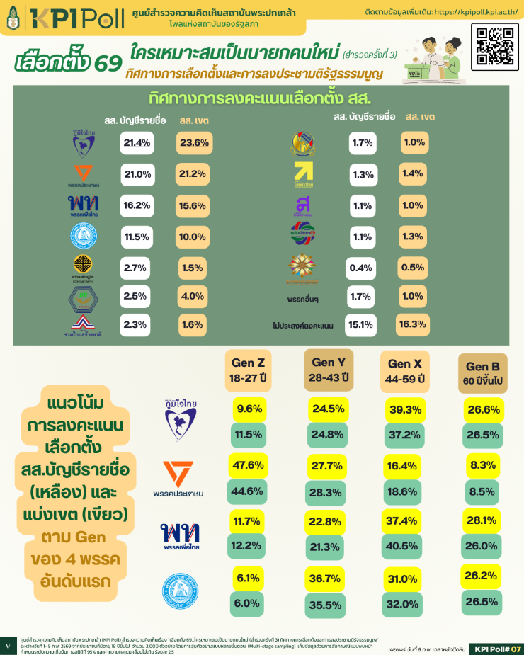 สถาบันพระปกเกล้า เปิดเผย ผลสำรวจ เรื่อง “เลือกตั้ง 69…ใครเหมาะสมเป็นนายกฯคนใหม่ (สำรวจ ครั้งที่ 3) ทิศทางการเลือกตั้ง และการลงประชามติรัฐธรรมนูญ” โดย รองศาสตราจารย์ ดร.อิสระ เสรีวัฒนวุฒิ เลขาธิการ สถาบันพระปกเกล้า ในฐานะผู้อำนวยการศูนย์ KPI Poll มอบนโยบายสำคัญในการทำ KPI Poll ให้เป็นโพลเชิงวิชาการ ที่ออกแบบมาเพื่อสะท้อนความจริงทางการเมือง ด้วยความ “เป็นกลาง เป็นจริง เป็นประโยชน์” มีมาตรฐานวิชาการ และความแม่นยำ ไม่มุ่งเน้นให้เกิดการชี้นำการเมือง แต่จัดท า เพื่อ “ฟัง” การเมืองจากเสียงของประชาชน โดยให้ข้อมูล จาก KPI Poll เป็นฐานความรู้สำคัญ สำหรับ นักการเมือง พรรคการเมือง นักวิชาการ และสาธารณชน เพื่อทำหน้าที่ เป็น “คลังสมอง ทางประชาธิปไตย” ของสังคมไทย อย่างแท้จริง