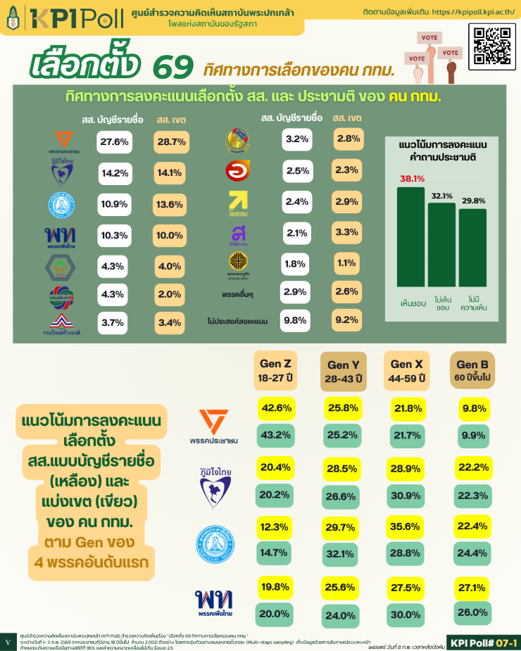 การแถลงผลการสำรวจ KPI Poll ครั้งที่ 07 ที่ศูนย์ฯ ได้ทำการสำรวจ ระหว่าง วันที่ 30 ม.ค.-5 ก.พ. 2569 จากประชาชนที่มีอายุ 18 ปี ขึ้นไป กระจายตามภูมิภาค ทั่วประเทศ จำนวน 2,000 ตัวอย่าง (ภาพรวมและกรุงเทพมหานคร) และ จังหวัด ละ 400 ตัวอย่าง ใน 4 จังหวัด โดยมี บทสรุปสำคัญจากผลสำรวจ ดังนี้