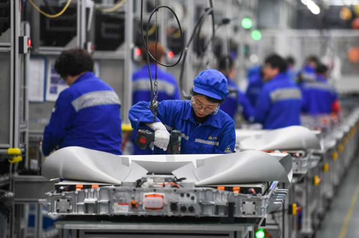 (แฟ้มภาพซินหัว : คนงานผลิตแบตเตอรี่ในโรงงานแห่งหนึ่ง ในเมืองลี่หยางเมืองระดับอำเภอ ในมณฑลเจียงซู ทางตะวันออกของจีน)