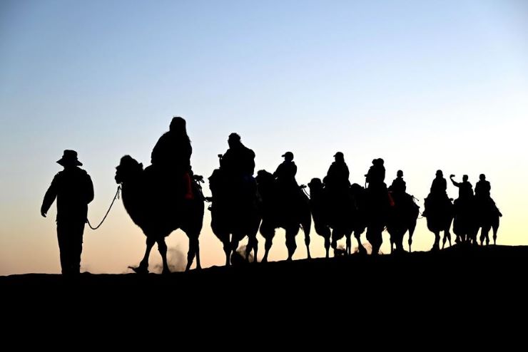 (แฟ้มภาพซินหัว :ผู้คนขี่อูฐท่องเที่ยว ในจุดชมวิวแหล่งท่องเที่ยวทะเลสาบจันทร์เสี้ยว และเนินทรายหมิงซา เมืองตุนหวง มณฑลกานซู่ ทางตะวันตกเฉียงเหนือของจีน วันที่ 1 ต.ค. 2025)