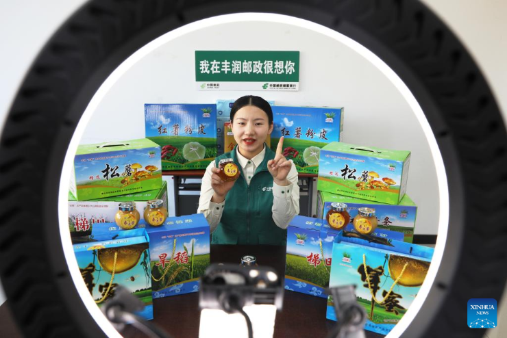 (แฟ้มภาพซินหัว : เจ้าหน้าที่ไลฟ์สดโปรโมตผลผลิตทางการเกษตรที่สาขาหนึ่งของไชน่า โพสต์ (China Post) ในเมืองถังซาน มณฑลเหอเป่ย ทางตอนเหนือของจีน วันที่ 11 พ.ย. 2025)