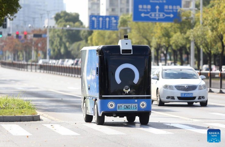 (แฟ้มภาพซินหัว : รถส่งของไร้คนขับกำลังส่งพัสดุในเมืองหยางโจว มณฑลเจียงซู ทางตะวันออกของจีน วันที่ 11 พ.ย. 2025)