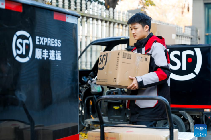 (แฟ้มภาพซินหัว : พนักงานส่งของถือกล่องพัสดุที่บริษัทขนส่งเอสเอฟ เอ็กซ์เพรสส์ ในอำเภออู่จื้อ มณฑลเหอหนาน ทางตอนกลางของจีน วันที่ 11 พ.ย. 2025)
