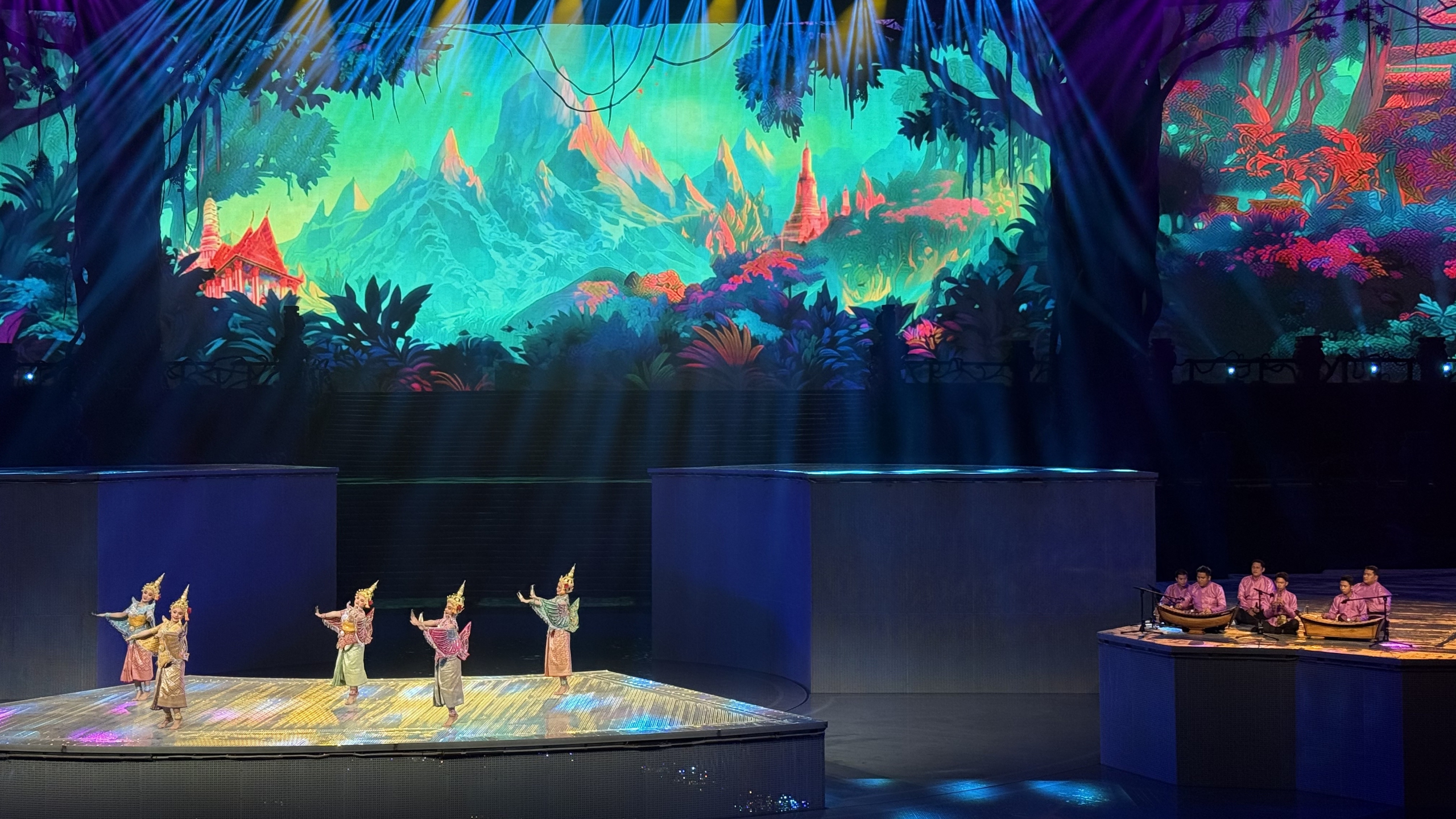 ภายในโรงละครใหญ่แห่งนี้ ได้สร้างสรรค์ออกแบบเวทีอย่างประณีต โดยใช้แม่น้ำโขง-ล้านช้างเป็นแกนหลักถ่ายทอดเรื่องราวอันล้ำค่า เมื่อม่านการแสดงเปิดออก “สายน้ำ” สีเงิน ดุจริบบิ้นไหลรินอยู่บนเวที พาผู้ชมเข้าสู่โลกอันลึกลับ และเปี่ยมด้วยเสน่ห์ต่างถิ่นอันหลากสีสัน ขณะที่รอบเวทีได้เสกสรรค์เสมือนอยู่ท่ามกลางป่าฝนเขตร้อน ผสมผสานการใช้แสงไฟและเวทีปรับระดับขึ้นลง และพ่นหมอกน้ำเพิ่มสร้างบรรยากาศให้หลงใหล ถ่ายทอดสายน้ำบ้างก็เชี่ยวกราก บ้างก็เรียบสงบตามจังหวะทำนองของการแสดง รวมถึงสื่อวิวทิวทัศน์ตระการตาริมสองฝั่ง และวัฒนธรรมหลากหลายของแต่ละประเทศ อย่างมีชีวิตชีวา