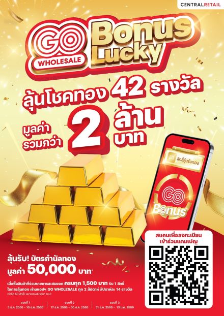 โก โฮลเซลล์ (GO WHOLESALE) ศูนย์ค้าส่งวัตถุดิบอาหาร ที่มีความสดใหม่ตลอดเวลา เพื่อผู้ประกอบการ ภายใต้การดำเนินงานของ บริษัท เซ็นทรัล ฟู้ด โฮลเซลล์ จำกัด ในเครือเซ็นทรัล รีเทล จับกระแสความต้องการทองคำของคนไทยที่ยังเติบโตต่อเนื่อง มาใช้เป็นมาร์เก็ตติ้งแคมเปญ ช่วงปลายปี เพื่อกระตุ้นกำลังซื้อ ภายใต้ชื่อ “GO Bonus GO Lucky” ที่ชวนให้ลูกค้าสมาชิกได้ลุ้นโชคเป็นทองคำ! เพียงซื้อสินค้าครบ 1,500 บาท มีสิทธิ์ทันที กับการลุ้นรับทองคำทุกสองสัปดาห์ สัปดาห์ละ 14 รางวัล รวม 42 รางวัล มูลค่ากว่า 2 ล้านบาท รวมถึงยังมีส่วนลดพิเศษจาก 20 แบรนด์ พันธมิตรเข้าร่วมแคมเปญนี้ด้วย
