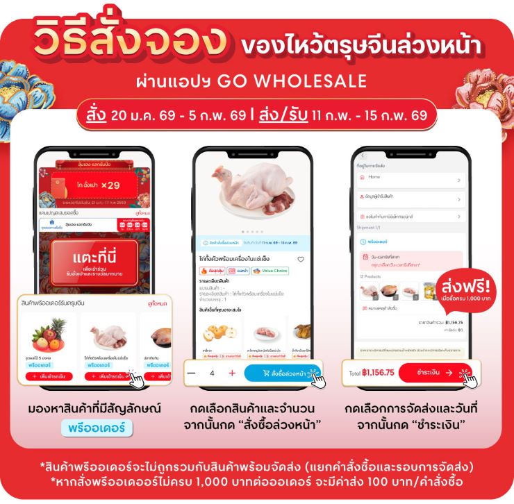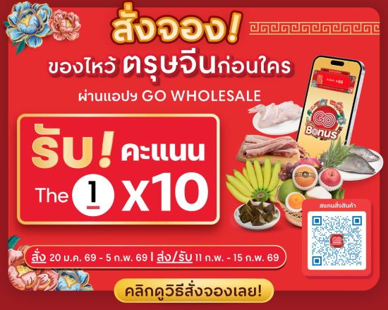 ที่สำคัญ โก โฮลเซลล์ เปิดบริการพรีออเดอร์ รับสั่งของล่วงหน้า เพิ่มความสะดวกและเตรียมความพร้อมก่อนวันไหว้ ผ่านแอปฯ GO WHOLESALE รับคะแนน The1 X10 เริ่มสั่งซื้อตั้งแต่วันนี้ถึง 5 กุมภาพันธ์ 2569 พร้อมรับสินค้า ในวันที่ 11 – 15 กุมภาพันธ์ 2569 ซึ่งมีวัตถุดิบที่ใช้ในเทศกาลตรุษจีนแบบ สด ครบ คุ้ม ทั้งอาหารสด อาหารแห้ง อาหารแช่แข็ง ผัก ผลไม้ และชุดเครื่องไหว้ต่างๆ