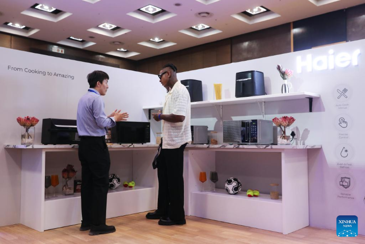 (แฟ้มภาพซินหัว : ชายคนหนึ่ง สอบถามเกี่ยวกับผลิตภัณฑ์ในพิธีเปิดตัวผลิตภัณฑ์ที่จัดขึ้นโดยบริษัทไฮเออร์ (Haier) ในเมืองโจฮันเนสเบิร์กของแอฟริกาใต้ วันที่ 2 ก.พ. 2026)