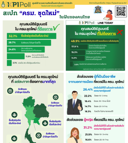 สถาบันพระปกเกล้า เปิดเผย ผลสำรวจ เรื่อง “สเปก ครม.ชุดใหม่ ในฝันของคนไทย” โดย รองศาสตราจารย์ ดร.อิสระ เสรีวัฒนวุฒิ เลขาธิการ สถาบันพระปกเกล้า ในฐานะ ผู้อำนวยการศูนย์ KPI Poll มอบนโยบายสำคัญในการทำ KPI Poll ให้เป็นโพลเชิงวิชาการที่ออกแบบมา เพื่อสะท้อนความจริง ทางการเมืองด้วยความ “เป็นกลาง เป็นจริง เป็นประโยชน์” มีมาตรฐานวิชาการ และความแม่นยำ ไม่มุ่งเน้นให้เกิดการชี้น าการเมือง แต่จัดทำ เพื่อ “ฟัง” การเมืองจากเสียงของประชาชน โดยให้ข้อมูลจาก KPI Poll เป็นฐานความรู้สำคัญ สำหรับนักการเมือง พรรคการเมือง นักวิชาการ และสาธารณชน เพื่อทำหน้าที่เป็น “คลังสมองทางประชาธิปไตย” ของสังคมไทยอย่างแท้จริง