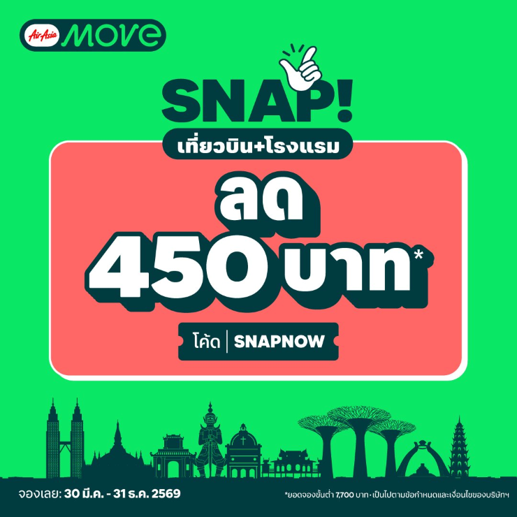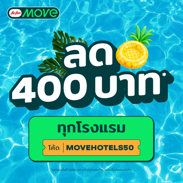 AirAsia MOVE จัดเต็ม ดีลสุดคุ้ม ต้อนรับฤดูกาลท่องเที่ยว (High Season) ให้คุณออกไปสำรวจโลกได้ในราคาประหยัดกว่าเดิม ด้วยส่วนลดพิเศษ สำหรับจองโรงแรมทั่วโลก ลดเพิ่มทันที 400 บาท เพียงใส่โค้ด MOVEHOTELS50 (เมื่อมียอดจองขั้นต่ำ 3,000 บาท) และสำหรับสายเที่ยวแบบแพ็กเกจสุดคุ้มกับ SNAP! (เที่ยวบิน+โรงแรม) ทุกจุดหมายปลายทาง รับส่วนลดเพิ่ม 450 บาท เมื่อใส่โค้ด SNAPNOW (เมื่อมียอดจองขั้นต่ำ 7,700 บาท) จองเลยวันนี้ที่แอป AirAsia MOVE เพื่อสัมผัสประสบการณ์ “บิน พัก เที่ยว แอปเดียวครบ” ในราคาสบายกระเป๋า