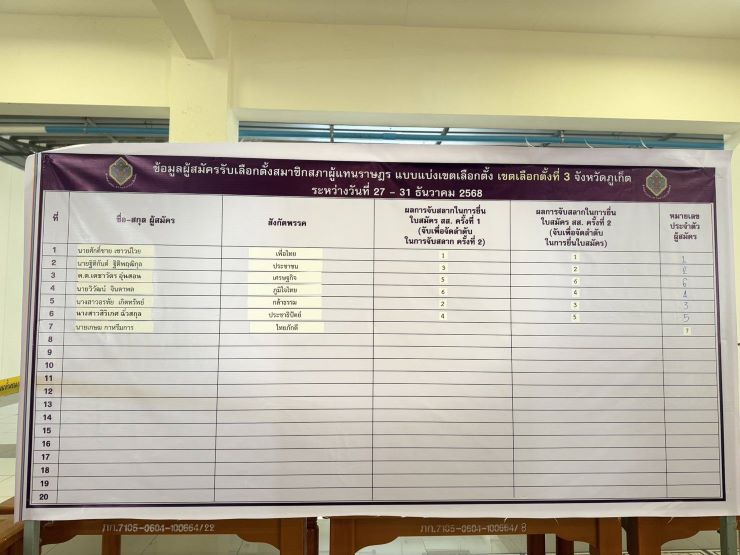 วันที่ 27 ธันวาคม 2568 : สำนักงาน คณะกรรมการการเลือกตั้งประจำจังหวัดภูเก็ต (กกต. ภูเก็ต) เปิดฉาก รับสมัครเลือกตั้งสมาชิกสภาผู้แทนราษฎร (สส.) วันแรกอย่างเป็นทางการ ณ หอประชุมมหิศรภักดี โดยบรรยากาศเป็นไปอย่างคึกคัก พรรคการเมืองระดับแม่เหล็ก และพรรคหน้าใหม่ ตบเท้า ส่งผู้สมัครครบทั้ง 3 เขตเลือกตั้ง สะท้อนถึงสมรภูมิการเมืองที่ทวีความเข้มข้นในพื้นที่ยุทธศาสตร์ทางเศรษฐกิจ ที่สำคัญที่สุดแห่งหนึ่งของไทย กองเชียร์ทุกพรรคการเมืองมาให้กำลังใจล้นหลาม