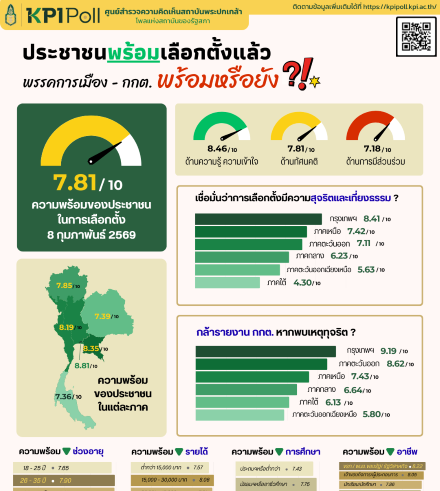 สถาบันพระปกเกล้า เปิดเผย ผลสำรวจ เรื่อง “ความพร้อมของประชาชนต่อการเลือกตั้ง 8 ก.พ. 2569” โดย รองศาสตราจารย์ ดร.อิสระ เสรีวัฒนวุฒิ เลขาธิการ สถาบันพระปกเกล้า ใน ฐานะ ประธานศูนย์ KPI Poll มอบนโยบายสำคัญในการทำ KPI Poll ให้เป็นโพลเชิงวิชาการที่ ออกแบบมา เพื่อสะท้อนความจริงทางการเมืองด้วยความ “เป็นกลาง เป็นจริง เป็นประโยชน์” มีมาตรฐานวิชาการและความแม่นยำ ไม่มุ่งเน้นให้เกิดการชี้นำการเมือง แต่จัดทำเพื่อ “ฟัง” การเมืองจากเสียงของประชาชน โดยให้ข้อมูลจาก KPI