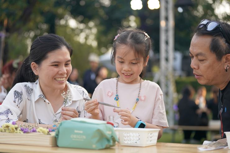กิจกรรมเวิร์กช็อปของที่ระลึกทำมือ สัมผัสแรงบันดาลใจที่สืบสานจากพระราชปณิธาน ผ่านงานประดิษฐ์ที่ผสานความงดงามของดอกไม้ ผ้าไหมไทย และธรรมชาติอย่างเปี่ยมความหมาย อาทิ กิจกรรมประดิษฐ์น้ำหอมในขวดแบบก้านไม้หอม กิจกรรมประดิษฐ์พวงกุญแจจากผ้าไหมไทย กิจกรรมปลูกต้นไม้ในกระถางอิฐ